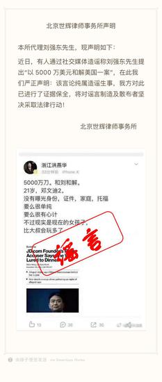 此前有网友在微博上发帖称,刘强东“以5000万美元宽和美国一案”,对此,刘强东代理律师事务所北京世辉律师事务所发布声明,称“该言辞纯属蜚短流长,我方对此已进行了依据保全,将对流言制作及散布者坚决采纳法律行动”。